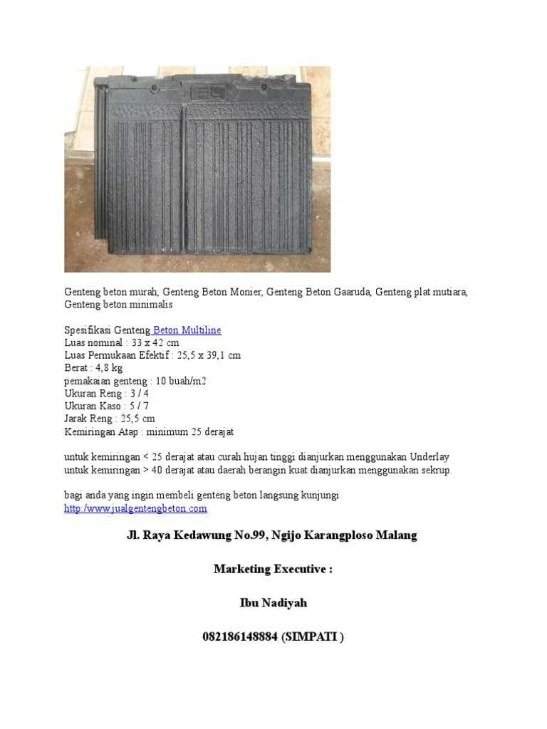 Genteng beton juga kerap disebut sebagai genteng cor sebab proses pembuatannya yang di cetak genteng beton pada umumnya diaplikasikan pada atap rumah minimalis yang memiliki konsep berikut adalah beberapa daftar harga genteng beton harga genteng beton flat, harga genteng. Pasalnya, atap ini memiliki fungsi sebagai pelindung penghuni rumah dari berbagai macam cuaca yang tidak menentu, seperti panas dan hujan. Tentu saja pemilihan selain genteng murah juga berkualitas, bukan murahan. Untuk pemesanan klik disini | hubungi kami di telp. Jual genteng beton menyediakan bermacam produk genteng beton berkualitas yang reccomended bagi pembangunan rumah baru anda.