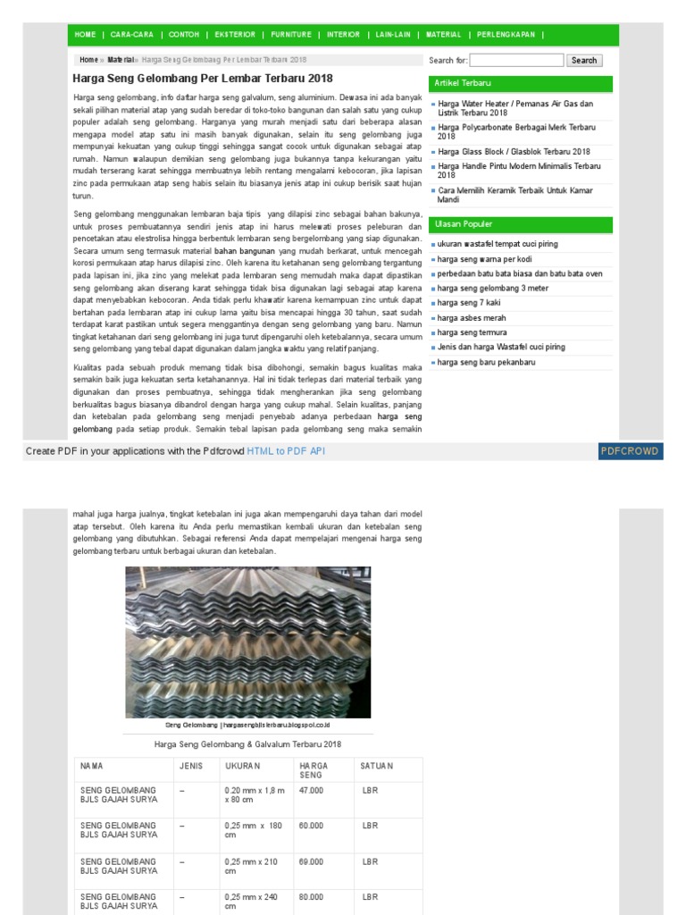 Berikut akan kami uraikan informasi mengenai harga atap seng bergelombang per meter dan per lembar terbaru 2021 beserta penjelasannya di bawah ini. Penggunaan seng saat ini terbatas untuk talang air / jalan air di atas atap. Hal yang perlu diperhatikan dalam memasang talang. Untuk harga seng talang galvalum dengan ketebalan 0.35mm, tinggi 120 cm dibanderol mulai dari rp 65.000 per meter. Jika anda saat ini memang sedang membangun rumah atau. Perbedaan harga atap seng di pasaran akan ditentukan berdasarkan tingkat ketebalan dan jenisnya. Oleh karenanya harga seng galvalum bisa beragam. Keunggulan penggunaan seng gelombang salah satunya adalah harga yang relatif terjangkau sehingga menghemat biaya pembangunan atau renovasi rumah. Pada kesempatan kali ini, 99.co indonesia akan mengulas harga seng gelombang terbaru tahun 2020. Harga atap seng gelombang terbaru mengikuti update per hari ini atau sekarang. Harga seng gelombang terbaru 2017. Dan semakin bagus dan kuat kualitasnya, tentu harga semakin tidak murah. Sedangkan untuk seng yang berukuran 0,30 mm dikenakan biaya sekitar rp 70.000 per.